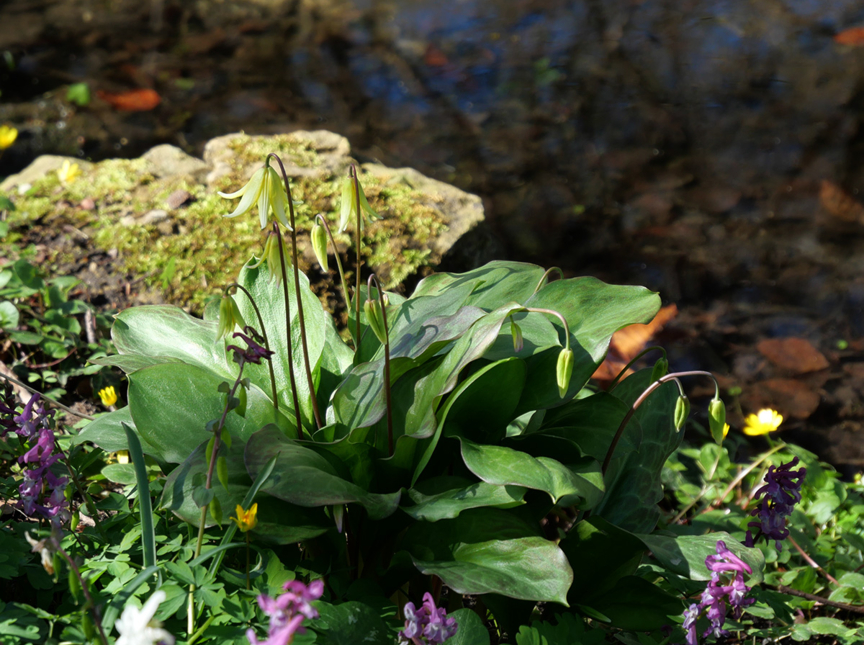Zart und lilienartig ziert im Frühjahr der blühende Hundszahn das Ufer des Bachlaufs im Berggarten.