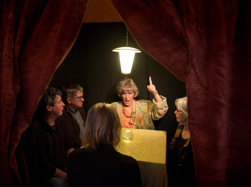 Sobald Marthilda Sliert orakelnd in die Zukunft blicken will, geht einfach alles schief. Die verrücktesten Dinge passieren, die Stimmung ist ausgelassen. Besucher*innen geraten außer Kontrolle. Die ausgeflippte Marthilda sorgt dennoch für eine lebhafte und positive Atmosphäre. Wann immer möglich, gibt sie wertvolle Ratschläge, ungefragt. Man kann ihr nicht entkommen. Wem das unheimlich ist: Es gibt absolut keine richtigen und keine falschen Vorhersagen. Dafür aber sehr viel Spaß.