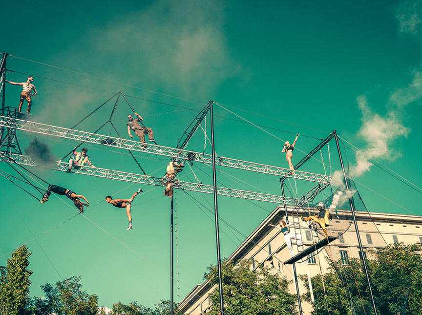 Sieben internationale Artist*innen, begleitet von zwei Live-Musiker*innen aus der Schweiz, bieten atemberaubende Luftakrobatik. Fliegende Menschen wirbeln über den Großen Garten in dreizehn Meter Höhe. Sie performen zwischen Masten, Seilen, Plattformen und Trapezstangen, schlagen Saltos und Pirouetten in der Luft, fangen sich gegenseitig und fallen in die Tiefe. Ein spektakuläres Tribut an den ungebändigten Geist Berlins.