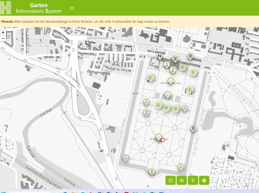 Mit dieser Browser basierten App bieten die Herrenhäuser Gärten bequem und schnell Informationen zu einzelnen Sehenswürdigkeiten im Großen Garten. Die Benutzung funktioniert über den Browser im Mobiltelefon oder anderen digitalen Geräten. Über die webadresse gartenis.de gelangt man zu einem anklickbaren digitalen Plan des Großen Gartens. Im Nah-Bereich der eingezeichneten Markierungen auf der Karte erscheint die Information zu der Sehenswürdigkeit inklusive eines Bildes auf dem Bildschirm.