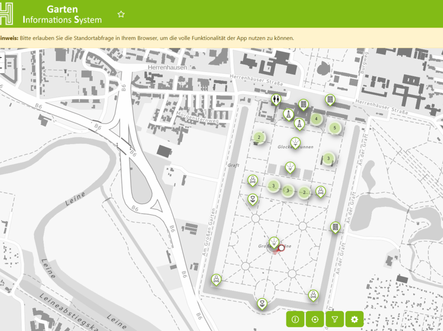 Mit dieser interaktiven Gartenkarte bieten die Herrenhäuser Gärten bequem und schnell Informationen zu einzelnen Sehenswürdigkeiten im Großen Garten. Die Benutzung funktioniert über den Browser im Mobiltelefon oder anderen digitalen Geräten. Über die webadresse gartenis.de gelangt man zu einem anklickbaren digitalen Plan des Großen Gartens. Im Nah-Bereich der eingezeichneten Markierungen auf der Karte erscheint die Information zu der Sehenswürdigkeit inklusive eines Bildes auf dem Bildschirm.